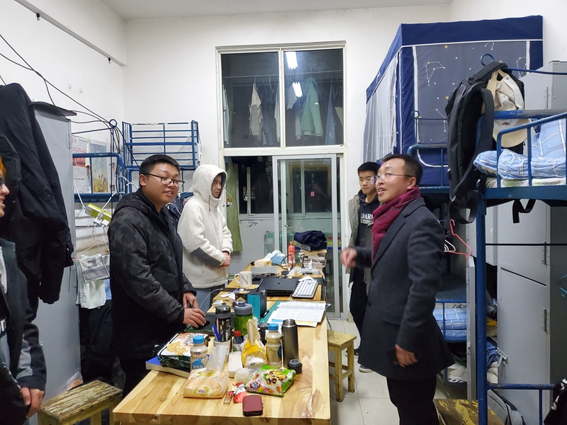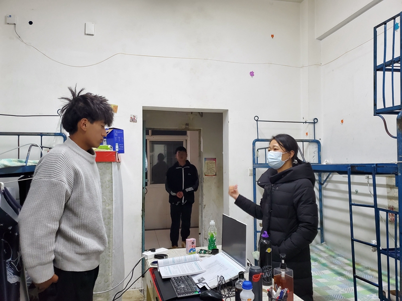 晚上21:00,参与检查的全体老师在13栋大厅汇合后,潘多书记就本次深入学生宿舍的任务及需要重点提醒学生注意事项做了简单说明并正式开始了检查工作。各年级辅导员及各班班主任老师进入本班学生宿舍详细询问了学生离校安排,归家行程,叮嘱学生离校过程中要听从学校安排,离校前要检查宿舍用水、用电安全,清理好宿舍卫生并及时上交相关手续;留校学生要和老师保持联系,确保在校安全,离校同学在离校途中要保持联系畅通随时告知父母、老师行程安排,出行时要乘坐有营运资质车辆并及时上交所乘车辆信息,遵守各地疫情防控要求,做好自我防护,注意好自己的人身安全及财产安全;离校期间在网上不浏览、不发布反动信息、不造谣、不传谣,不从事、参与任何与学生身份不符的活动。