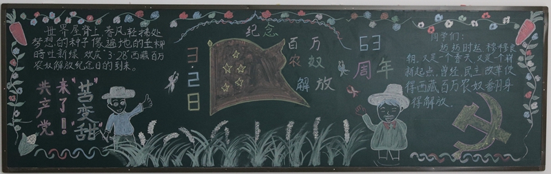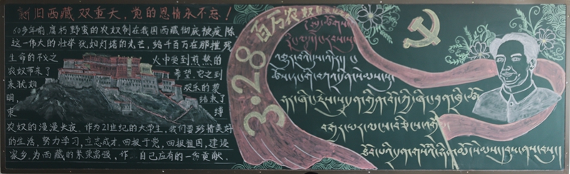 为深入贯彻习近平总书记关于“治边稳藏”的重要论述和“建设美丽幸福西藏,共圆伟大复兴梦想”的重要指示精神,引导我院学生铭记历史,展现新时代青年大学生的责任与担当,维护国家统一。水利土木工程学院于2022年3月28日举办了“纪念3.28解放日”主题黑板报评比活动。