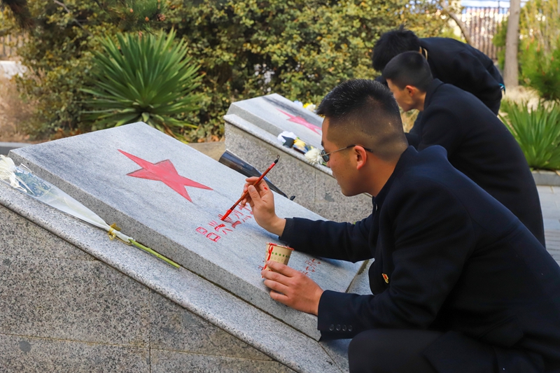 随后,同志们集体向革命先烈默哀,并由辅导员石徐老师带领同志们重温入党誓词。“我志愿加入中国共产党……,永不叛党”。党员们面向鲜红的中国共产党党旗,高举右拳,庄严宣誓,铿锵有力的入党誓词响彻烈士陵园,回荡在空中,在耳边久久环绕,深深地印入同志们心中。宣誓结束,同志们绕墓一周向革命烈士敬献鲜花,分组瞻仰烈士陵墓,清扫陵园,擦拭墓碑,为烈士墓碑描红。同志们用共产党员特有的方式,向长眠在这里的革命先烈,表达深沉的哀思和无尽的怀念。