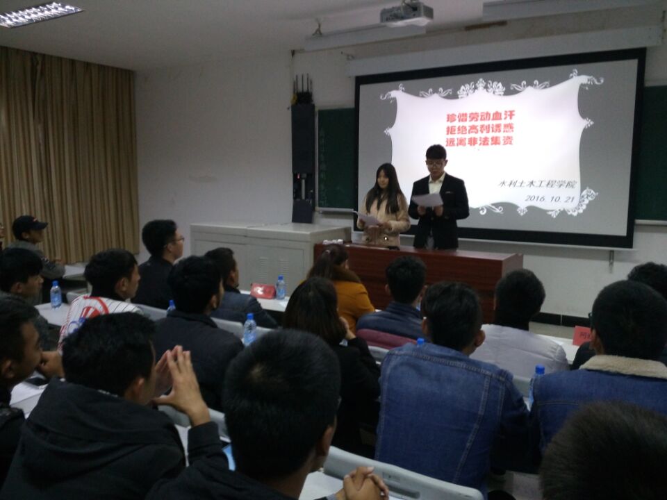 为提高我院学生非法集资意识,避免上当受骗,我院学生会于2016年10月21日19:30在第四教学楼4015教室举行了关于“非法集资”的观影活动。出席本次活动的有我院学生科科长潘多、辅导员普布桑珠、学生会主席、团总支副书记及我院各班班长、团支书、学习委员等。