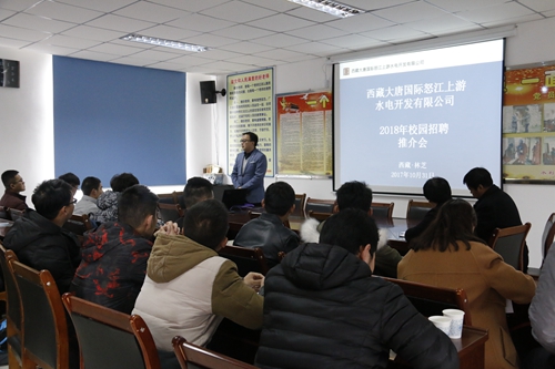 为不断丰富我院毕业生就业知识,提高就业能力技巧,实现多渠道就业,落实精准就业帮扶,2017年10月31日14:00,水土学院特邀大唐国际怒江水电开发有限公司在学院会议室开展了公司2018年毕业生校园招聘推介会。大唐国际怒江水电开发有限公司人力资源部主任张宏宇、学院党委书记达瓦、副院长罗红英、就业辅导员达娃卓玛以及能源与动力工程专业37名毕业生参加了推介会。