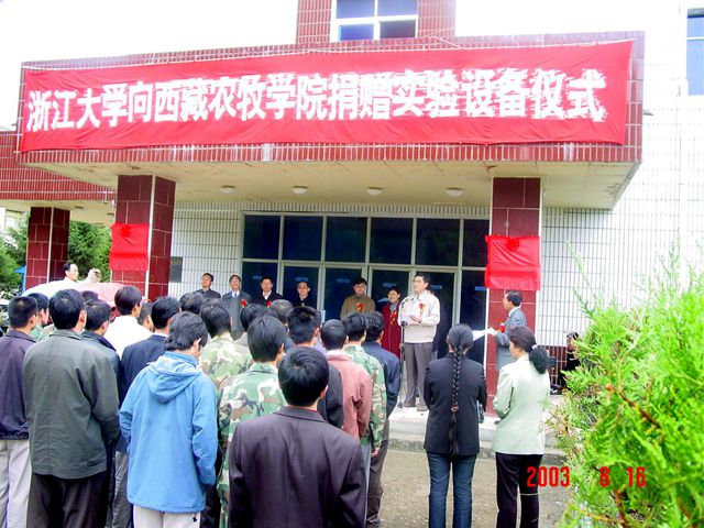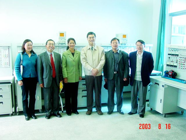 2003年8月与浙大潘云鹤校长(右三)、浙大电气学院徐德鸿院长(右一)等在援建的实验室中合影留念