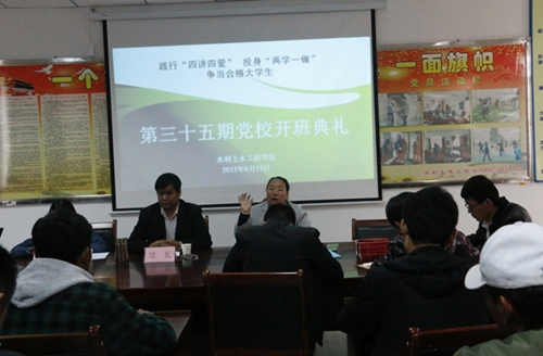 为深入推进“两学一做”学习教育,丰富“四讲四爱”主题教育实践活动内容,进一步为积极向党组织靠拢的入党积极分子搭建一个培训教育平台,根据水土学院党建工作计划,在前期精心准备后学院党委同意举办了学院第三十五期党校,并于2017年6月24日13时在学院会议室举行了开班典礼,学院党委书记达瓦、副书记潘多、辅导员达娃卓玛、四个学生党支部副书记以及本期全体学员参加了典礼。典礼上,潘多宣读了《水土学院第三十五期党校实施办法》,详细介绍了本期培训班课程安排、学习内容、规章管理和考核办法,她强调全体学员要严格遵守培训纪律、教育要求,努力提高思想素质和理论水平。学员代表张志军在发言表态中说道,作为一名新时代大学生,要坚定理想信念、端正思想态度和入党动机,认真学习习近平总书记系列重要讲话精神,学习党史党规和党的方针路线、丰功伟绩,积极投入“两学一做”学习教育,认真践行“四讲四爱”,打牢思想基、提高思想觉悟,力争早日成为一名合格党员。