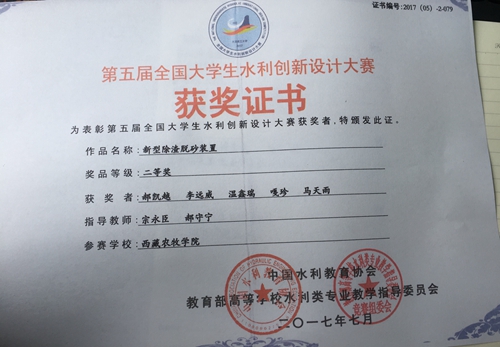 我院参赛作品名称为“新型除渣脱砂分离器”,参赛队伍由宗永臣和郝守宁担任领队,参赛学生5名。经过三天激烈的角逐,通过模型展示、评委提问、作品答辩等环节的竞争,充分体现了参赛作品的“水+生态”的主体理念、水利模型创新的设计概念和结合西藏实际的应用价值,最终脱颖而出,荣获本次比赛的二等奖。