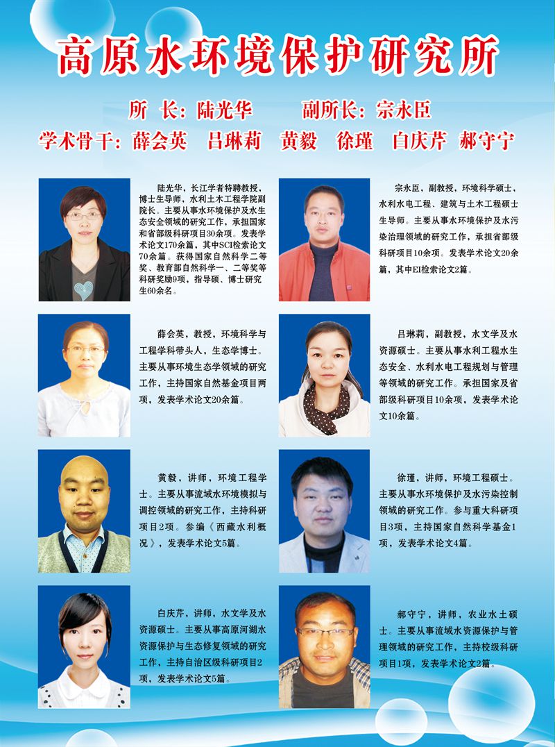 工程”和“环境科学与工程”等学科,以长江学者特聘教授为学术带头人(所长),成立“高原水环境保护研究所”暨“水环境保护学术创新团队”。