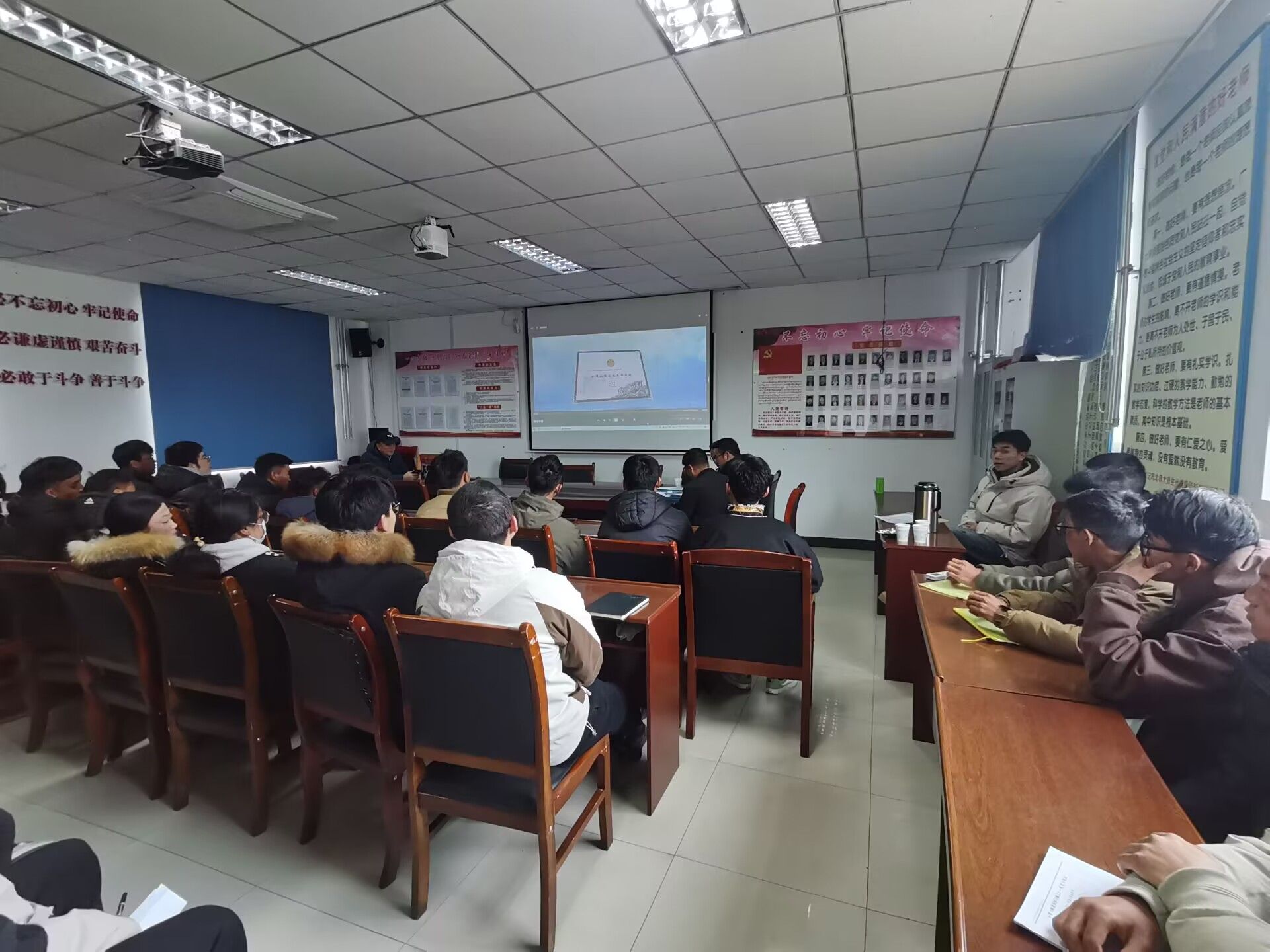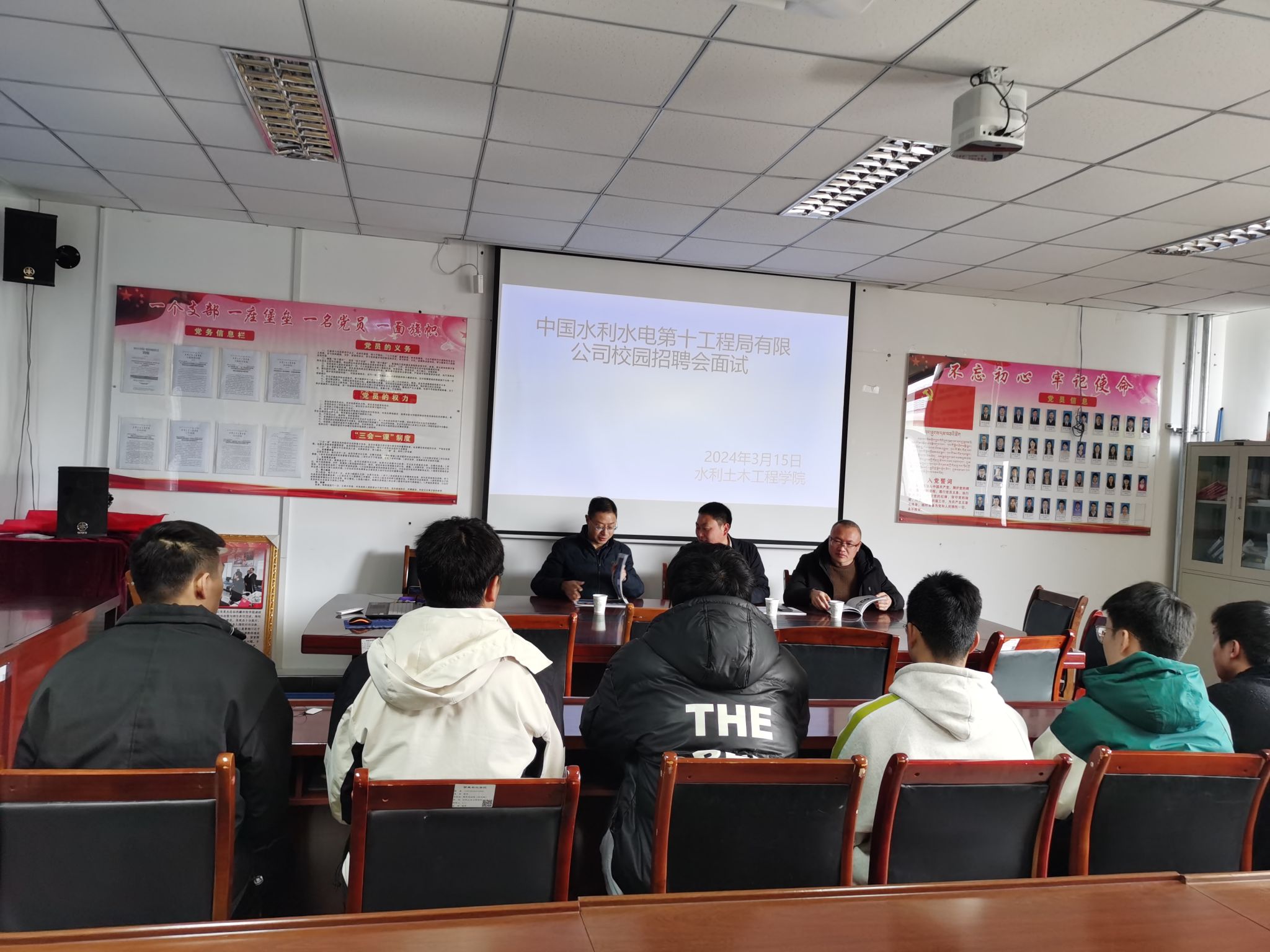 经过公司筛选简历,线上沟通,初步确定12名同学进入面试。3月15日公司分局副总经理胡欣,项目经理雷艳费和项目副经理陈鑫到校举行线下面试。
