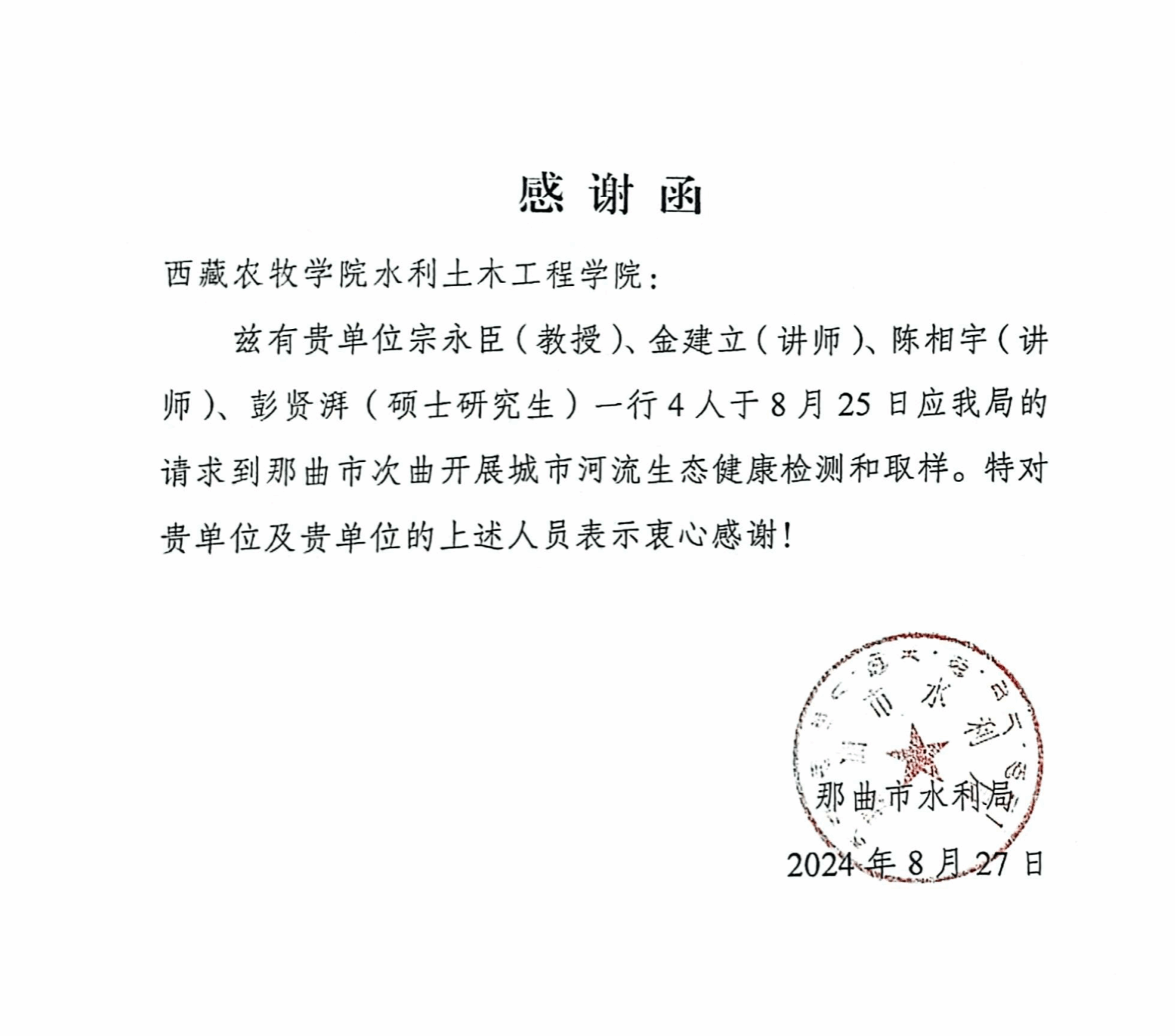 应那曲市水利局邀请,西藏农牧学院高原水生态安全和修复技术科研团队宗永臣教授团队一行4人于2024年8月24日-8月26日到那曲市次曲开展河流生态健康检测和取样。