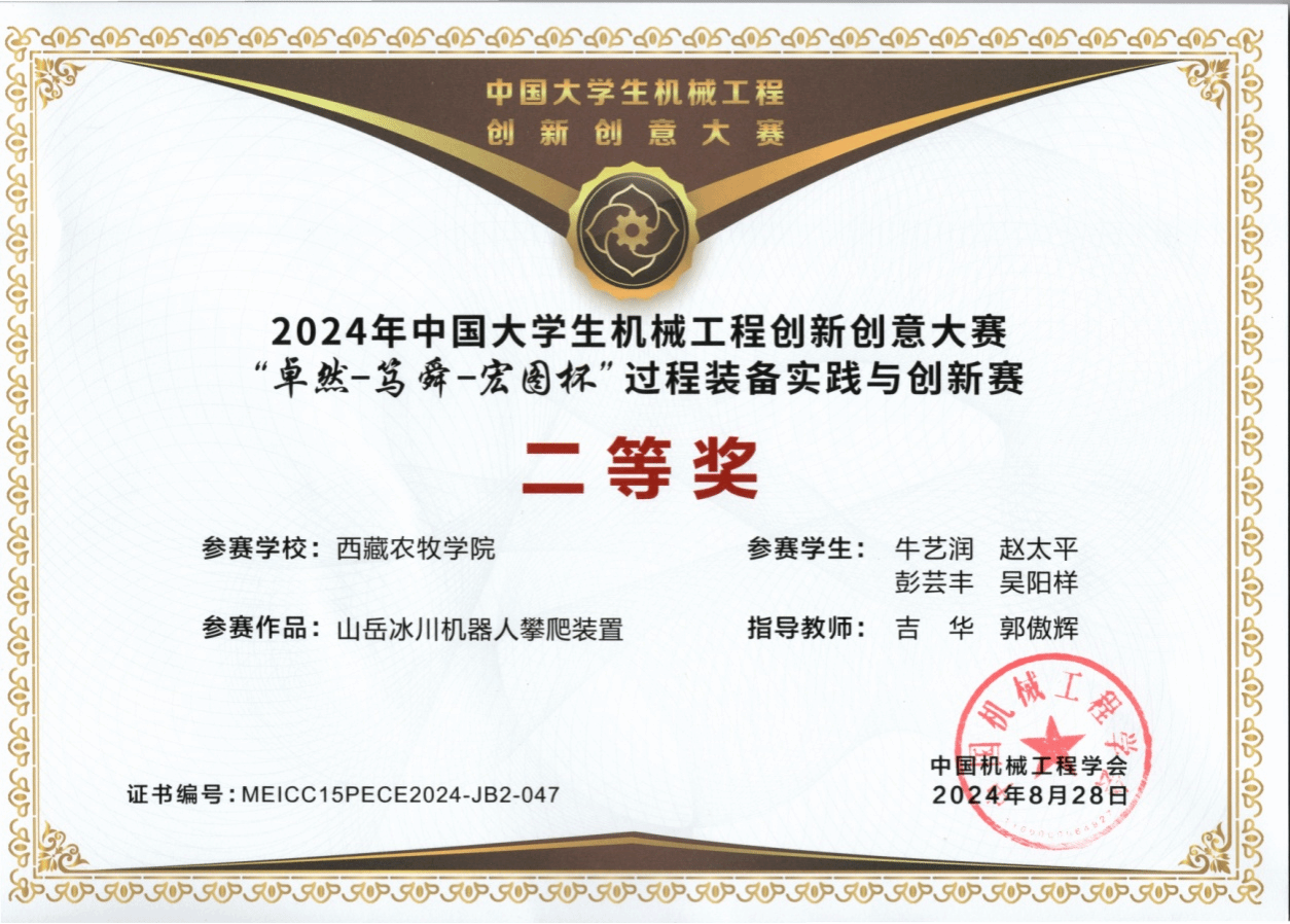 过程装备实践与创新赛是一项历史悠久的赛事,也一直列入中国高等教育协会竞赛目录。本届赛事主题为“新质生产力赋能过程装备”,聚焦装备的节能、环保、智能以及高质量发展要求。大赛组委会共收到了全国171所高校的2965个团队报名参赛作品,经过两轮网评、一轮现场比赛,我校作品《山岳冰川机器人攀爬装置》获得二等奖,进入了前10%。