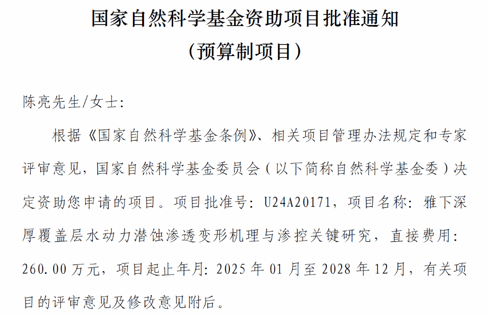 近日,国家自然科学基金委员会发布了一批国家自然科学基金资助项目批准通知。根据《国家自然科学基金条例》、相关项目管理办法规定和专家评审意见,水利土木工程学院陈亮教授依托西藏农牧学院主持申报的联合基金重点项目获得国家自然科学基金委员会的资助决定,资助直接经费260万元。