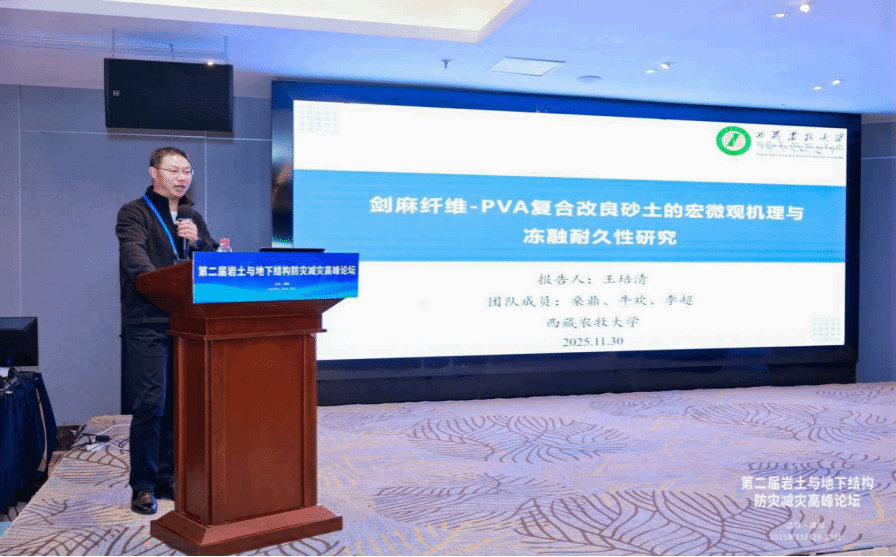 西藏农牧大学王培清教授作了题为“剑麻纤维—PVA复合改良砂土的宏微观机理与冻融耐久性研究”的报告,聚焦高寒地区工程土体改良问题,通过多尺度试验与机理分析,探讨了纤维复合材料在增强砂土工程性能及抗冻融循环能力方面的作用,为砂土改良与耐久性设计提供了新思路与新方法。
