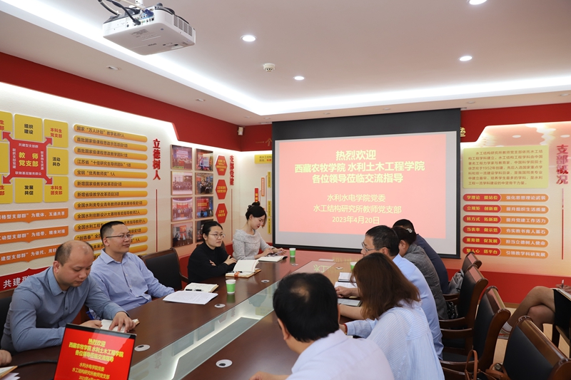 2023年4月20日上午,水利土木工程学院党委副书记院长王培清、党委副书记潘多、副院长陈亮等一行7人在河海大学江宁校区水利水电学院进行交流学习,河海大学水利水电学院副院长、水工结构研究所教师党支部书记赵兰浩教授、副书记张汉云副教授、纪检委员甘磊、宣传委员毛佳副教授、组织委员沈雷副教授、水电院22级本科生辅导员姜帆老师参加交流会,在教育部第二批“双带头人”教师党支部书记工作室芝纶馆513室,就水利教育教学、人才培养、科研合作和学生管理、服务等方面与我院进行了学习交流,会上还交流了党建方面的先进经验和做法,促进了两校教师党员间党务工作的密切合作。