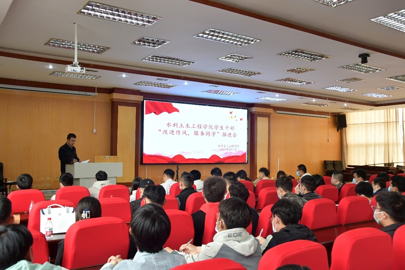 为进一步改进水利土木工程学院各学生组织的工作作风及服务意识,深化团学组织改革,提高学生干部的思想认识,做好青年大学生的思想政治引领、服务工作。水利土木工程学院于2022年6月4日上午11:00在研究生苑一号报告厅组织召开学生组织“改进作风,服务同学”推进会。学院团总支书记续辉、团总支副书记周小燕、学生会执行主席龙建刚及其他干部成员参加此次会议。