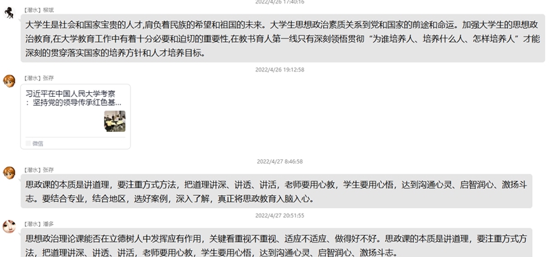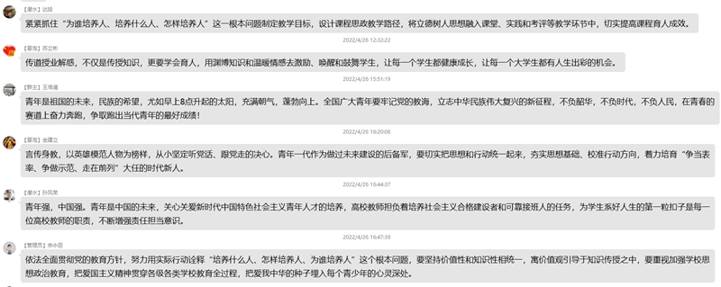 为持续深入学习习近平总书记到中国人民大学考察调研时的重要讲话及习近平总书记给北京科技大学的老教授回信精神,不折不扣将总书记的重要讲话精神贯彻到学院的工作全过程、各方面,始终把牢迎接和学习宣传贯彻党的二十大这条主线,进一步找准工作方向、明晰着力重点、突出自身优势、发挥更大作用,不断加强和改进党建思想政治引领工作。在五四青年节到来之际,习近平总书记来到中国人民大学考察,并深情寄语广大青年。4月26日、27 日我院迅速开展线上线下讨论,引发了全院师生的热烈反响。
