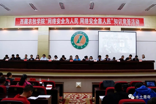 为积极响应本届国家网络安全宣传周活动,在我院营造“网络安全人人有责、人人参与”的浓厚氛围,培养学生成为有高度安全意识、有文明的网络素养、有守法的行为习惯、必备的防守技能的“四有好公民”,2018年9月18日,在宣传日当日下午7:00许,我院行政楼会议室举办了以“网络安全为人民,网络安全靠人民”为主题的知识竞赛活动。本次活动由院团委主办,水土学院承办,院团委书记黎普明、水土学院党委书记达瓦、宣传部王国新教授、植科学院党委副书记次仁央金、资环学院党委副书记邹联付、电气学院党委副书记普布次仁、水土学院党委副书记潘多、安保处综治科科长陈勇以及各二级学院相关辅导员老师、参赛选手和学生代表200余人参加了活动。