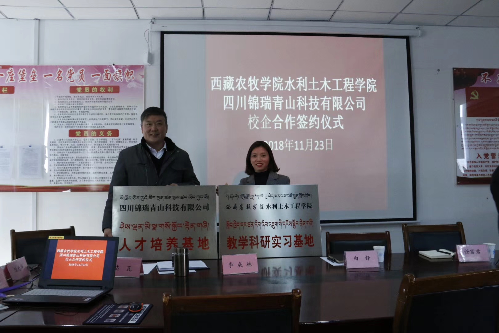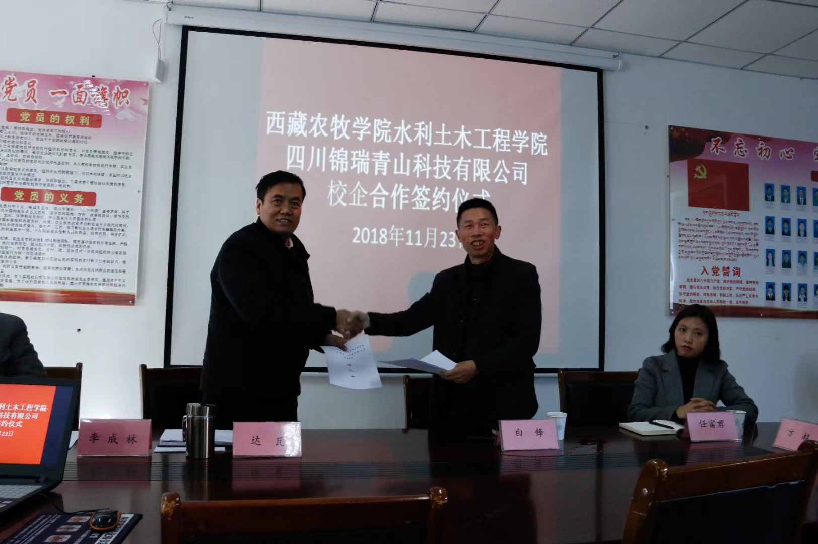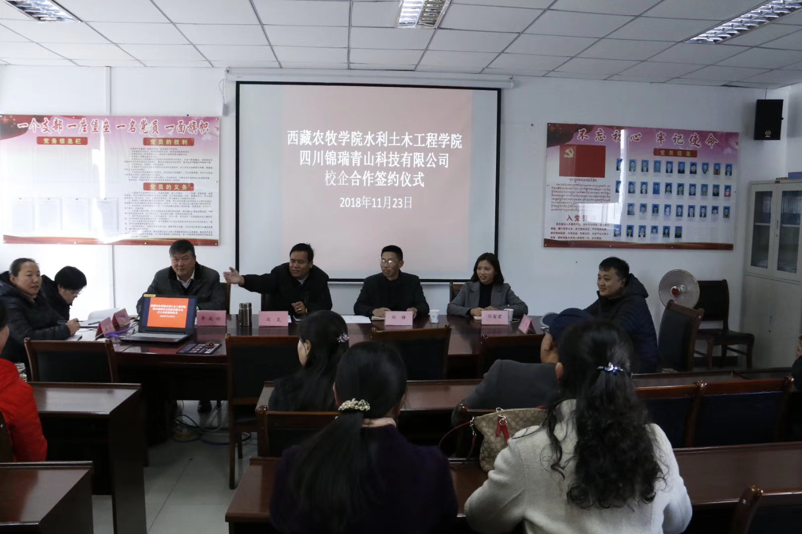 为深化教育思想大谈论活动内容,加强校企合作,提高人才培养质量,2018年11月23日下午,四川锦瑞青山有限公司与水利土木工程学院在学院会议室举行校企合作框架协议签字和揭牌仪式。学院党委书记达瓦、副院长李成林、副院长陆光华、副书记潘多、公司副总经理白锋、副总经理任富君、培训讲师方超、学院研究生秘书宋新伟以及相关老师参会。仪式由达瓦主持