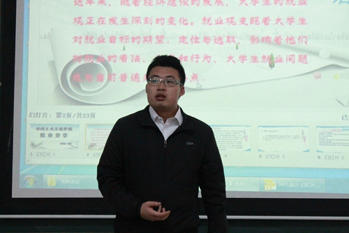 成功签约中铁二局的14级能动本张林同学以一种不一样的形式打开自己分享话题,从全国人力资源供需总体情况、西藏大学生就业形势、大学生生就业政策解读、不同企业薪资待遇对比、就业准备等方面徐徐展开讲解,落脚在了我院毕业生必须转变观念、树立自信、敢于挑战、用于竞争,起到了良好引导教育作用。