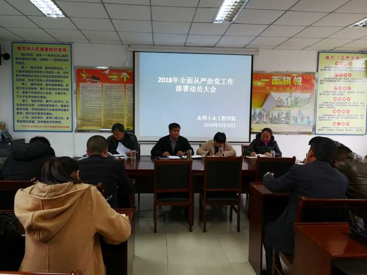 中国共产党作为执政党,担负着团结带领人民全面建成小康社会、推进社会主义现代化、实现中华民族伟大复兴的重任。 以习近平同志为核心的党中央以强烈的历史责任感和深沉的使命忧患感,把全面从严治党纳入“四个全面”战略布局,使党的面貌焕然一新,为党和国家事业发生历史性变革提供了坚强政治保证。为切实落实好全面从严治党主体责任目标,2018年4月19日,水土学院党委召开党建工作专题会议,对学院2018年度从严治党工作进行了动员部署。学院全体党委委员、师生各党支部和党员工作站主要负责人参加了会议。