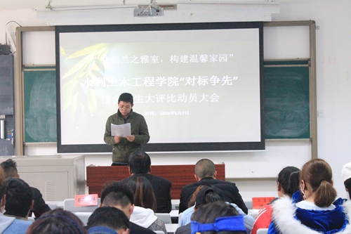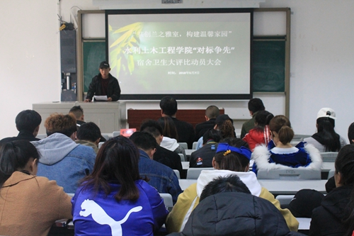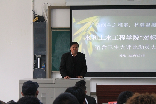 为深入开展“四讲四爱”主题教育实践活动,认真学习宣传、贯彻落实学院“对标争先”建设工作要求,在广大学生中倡导“讲卫生、讲文明、爱校园、爱生活”,营造良好的“赶有目标、学有先进”的氛围,形成良好的“创先争优、建功立业”的气氛,构建勤奋进取、积极向上、欣欣向荣的校风学风,水土学院以“共创兰芝雅室,构建温馨家园”为主题,以宿舍卫生为抓手,于5月7日—6月6日开展为期一个月的“对标争先”宿舍卫生大评比活动,努力使校园风尚更加文明、校园环境更加舒适、校园民族团结更加和睦、校园和谐更加稳定。为切实开展好此项活动,2018年5月7日,我院在4105教室举办了“对标争先”宿舍卫生大评比活动动员会议,学院党委书记达瓦、辅导员普布桑珠、党员工作站和学生会干部、各班级卫生委员、各宿舍寝室长参加了会议,会议由普布桑珠主持。