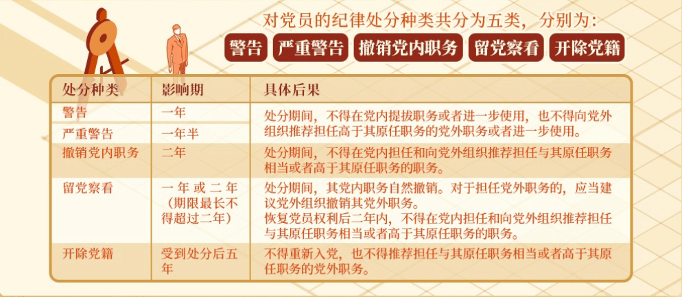 《中国共产党纪律处分条例》规定,对党员的纪律处分种类共分为五类,分别为警告、严重警告、撤销党内职务、留党察看和开除党籍。警告是党组织对违纪党员提出的告诫,以促使其认识和改正错误。警告是最轻的一种党纪处分,适用于违纪情节较轻、但必须给予党纪处分的党员。严重警告是一种重于警告的较轻党纪处分,适用于违纪性质和情节比较重的党员。撤销党内职务属于较重的党纪处分,适用于那些所犯错误性质、情节严重,不宜再担任现任全部党内职务或某一个或几个党内职务的违纪党员。留党察看是仅次于开除党籍的一种较重的党纪处分,适用于严重违纪、但尚未丧失共产党员条件,不宜再担任现任全部党内职务的党员。开除党籍是最重的党纪处分,适用于严重违纪、已丧失共产党员条件的党员。警告和严重警告处分影响和后果——党员受到警告处分一年内、受到严重警告处分一年半内,不得在党内提拔职务或者进一步使用,也不得向党外组织推荐担任高于其原任职务的党外职务或者进一步使用。其中,关于“一年内”“一年半内”的起算时间,是从警告或者严重警告处分批准之日起计算。撤销党内职务处分影响和后果——撤销党内职务处分,是指撤销受处分党员由党内选举或者组织任命的党内职务。对于在党内担任两个以上职务的,党组织在作处分决定时,应当明确是撤销其一切职务还是一个或者几个职务。如果决定撤销其一个职务,必须撤销其担任的最高职务。如果决定撤销其两个以上职务,则必须从其担任的最高职务开始依次撤销。对于在党外组织担任职务的,应当建议党外组织撤销其党外职务。对于在立案审查中因涉嫌违犯党纪被免职的党员,审查后依照本条例规定应当给予撤销党内职务处分的,应当按照其原任职务给予撤销党内职务处分。对于应当受到撤销党内职务处分,但是本人没有担任党内职务的,应当给予其严重警告处分。同时,在党外组织担任职务的,应当建议党外组织撤销其党外职务。党员受到撤销党内职务处分,或者依照前款规定受到严重警告处分的,二年内不得在党内担任和向党外组织推荐担任与其原任职务相当或者高于其原任职务的职务。留党察看处分影响和后果——留党察看处分,分为留党察看一年、留党察看二年。对于受到留党察看处分一年的党员,期满后仍不符合恢复党员权利条件的,应当延长一年留党察看期限。留党察看期限最长不得超过二年。党员受留党察看处分期间,没有表决权、选举权和被选举权。留党察看期间,确有悔改表现的,期满后恢复其党员权利;坚持不改或者又发现其他应当受到党纪处分的违纪行为的,应当开除党籍。党员受到留党察看处分,其党内职务自然撤销。对于担任党外职务的,应当建议党外组织撤销其党外职务。受到留党察看处分的党员,恢复党员权利后二年内,不得在党内担任和向党外组织推荐担任与其原任职务相当或者高于其原任职务的职务。需注意,这里的“二年内”,是指自党组织批准恢复受处分党员的党员权利之日起二年内,期间自留党察看期限期满之日起计算。开除党籍处分影响和后果——党员受到开除党籍处分,五年内不得重新入党,也不得推荐担任与其原任职务相当或者高于其原任职务的党外职务。另有规定不准重新入党的,依照规定。