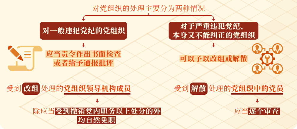 根据《中国共产党纪律处分条例》规定,对党组织的处理主要分为两种情况:对一般违犯党纪的党组织,上级党组织应当责令其作出书面检查或者给予通报批评;对于严重违犯党纪、本身又不能纠正的党组织,上一级党的委员会在查明核实后,根据情节的严重程度,可以予以改组或解散。