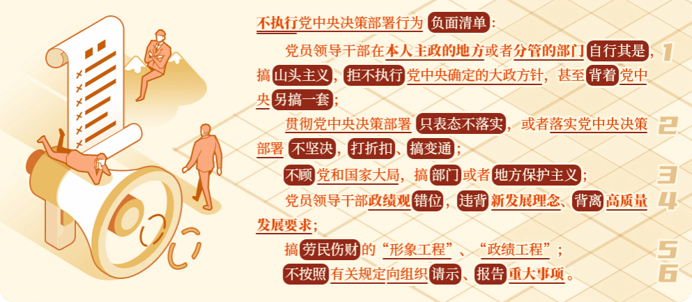 《中国共产党纪律处分条例》第五十六条、第五十七条、第六十一条对不执行党中央决策部署行为及其适用的处分种类和幅度作了规定。可分为三类:1.不落实党中央大政方针《条例》第五十六条规定了不落实党中央大政方针的三种行为表现:党员领导干部在本人主政的地方或者分管的部门自行其是,搞山头主义,拒不执行党中央确定的大政方针,甚至背着党中央另搞一套;贯彻党中央决策部署只表态不落实,或者落实党中央决策部署不坚决,打折扣、搞变通,在政治上造成不良影响或者严重后果;不顾党和国家大局,搞部门或者地方保护主义。其中,前两种行为严重程度不同:拒不执行党中央确定的大政方针行为危害更大,性质更恶劣,一旦存在就要给予撤销党内职务、留党察看或者开除党籍处分;贯彻党中央决策部署只表态不落实,或者落实党中央决策部署不坚决,打折扣、搞变通行为,在政治上造成不良影响或者严重后果的,视情节轻重给予警告直至开除党籍处分。不顾党和国家大局,搞部门或者地方保护主义的,同样视情节轻重给予警告直至开除党籍处分。2.政绩观错位,违背新发展理念、背离高质量发展要求《条例》第五十七条规定:党员领导干部政绩观错位,违背新发展理念、背离高质量发展要求,给党、国家和人民利益造成较大损失的,给予警告或者严重警告处分;情节较重的,给予撤销党内职务或者留党察看处分;情节严重的,给予开除党籍处分。实践中,一些党员领导干部在贯彻高质量发展要求上掉队、走偏,有的是能力不足或者工作作风问题,但也有些是政绩观错位造成的。一些党员领导干部把干事和个人名利捆绑在一起,私心杂念作祟,醉心于获取升迁资本,重显绩轻潜绩、重面子轻里子,好大喜功、急功近利,在贯彻新发展理念、推动高质量发展中偏离政治要求,造成严重危害。《条例》作此规定,有利于推动党员领导干部切实贯彻党中央要求,认真践行正确政绩观,把新发展理念、高质量发展要求落到实处。此外,该条还专门对搞劳民伤财的“形象工程”、“政绩工程”行为作出规定,明确有此行为的,从重或者加重处分。3.不按规定请示、报告重大事项《条例》第六十一条规定,不按照有关规定向组织请示、报告重大事项,对直接责任者和领导责任者,情节较重的,给予警告或者严重警告处分;情节严重的,给予撤销党内职务或者留党察看处分。重大事项,是指超出党组织和党员、领导干部自身职权范围,或者虽在自身职权范围内但关乎全局、影响广泛的重要事情和重要情况,包括党组织贯彻执行党中央决策部署和上级党组织决定、领导经济社会发展事务、落实全面从严治党责任,党员履行义务、行使权利,领导干部行使权力、担负责任的重要事情和重要情况。作为干部特别是领导干部,在涉及重大问题、重要事项时按规定向组织请示报告,这是必须遵守的规矩。《关于新形势下党内政治生活的若干准则》对请示报告制度作了明确规定,《中国共产党重大事项请示报告条例》进一步确立了请示报告的工作体制机制。《条例》以严格的纪律约束,保证相关党内法规关于请示报告制度和要求的落实。