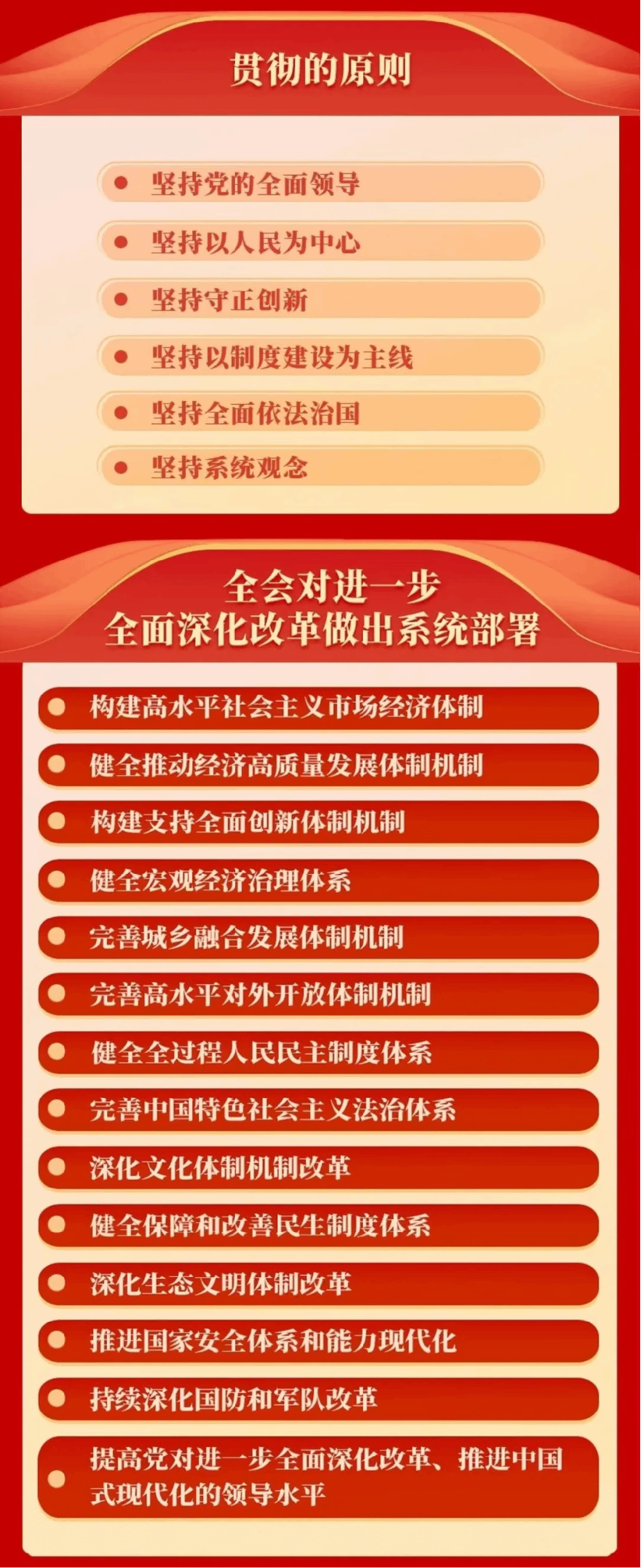 全会强调,进一步全面深化改革要总结和运用改革开放以来特别是新时代全面深化改革的宝贵经验,贯彻坚持党的全面领导、坚持以人民为中心、坚持守正创新、坚持以制度建设为主线、坚持全面依法治国、坚持系统观念等原则。