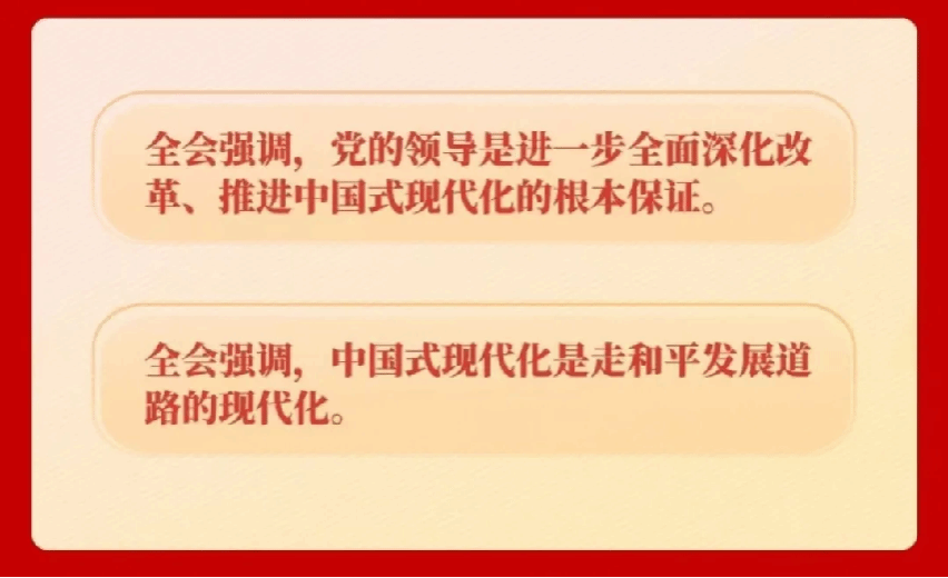 全会强调,中国式现代化是走和平发展道路的现代化。必须坚定奉行独立自主的和平外交政策,推动构建人类命运共同体,践行全人类共同价值,落实全球发展倡议、全球安全倡议、全球文明倡议,倡导平等有序的世界多极化、普惠包容的经济全球化,深化外事工作机制改革,参与引领全球治理体系改革和建设,坚定维护国家主权、安全、发展利益。