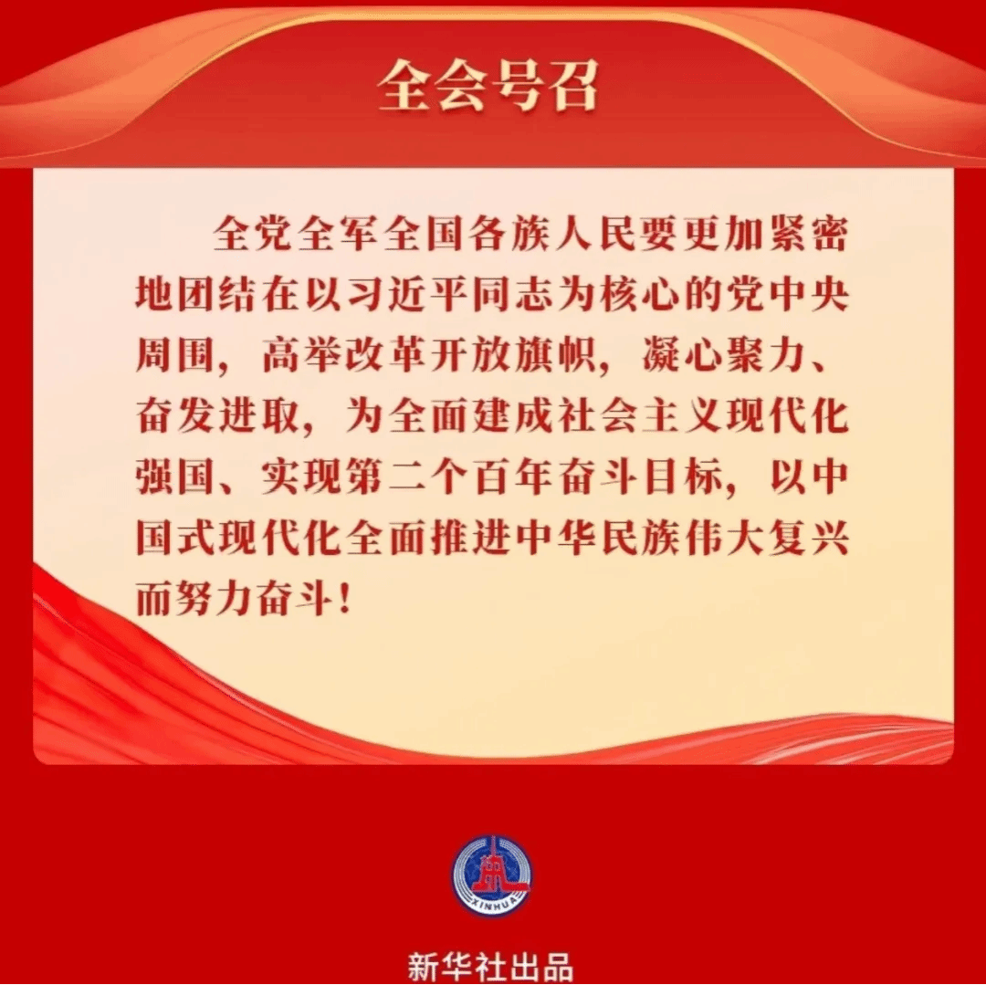 全会号召,全党全军全国各族人民要更加紧密地团结在以习近平同志为核心的党中央周围,高举改革开放旗帜,凝心聚力、奋发进取,为全面建成社会主义现代化强国、实现第二个百年奋斗目标,以中国式现代化全面推进中华民族伟大复兴而努力奋斗!