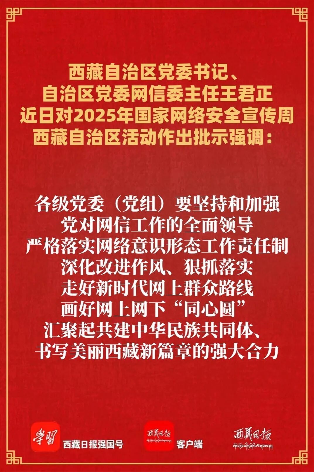 近日,自治区党委书记、自治区党委网信委主任王君正对2025年国家网络安全宣传周西藏自治区活动作出批示指出,今年是自治区成立60周年。习近平总书记率中央代表团亲临西藏视察、亲自出席自治区成立60周年庆祝系列活动,听取自治区党委和政府工作汇报并发表重要讲话、作出重要指示,充分体现了以习近平同志为核心的党中央对西藏工作的高度重视、对西藏各族人民的深情厚爱,给予我们强大的思想指引、精神鼓舞、奋斗感召,为我们做好西藏工作指明前进方向、提供根本遵循。