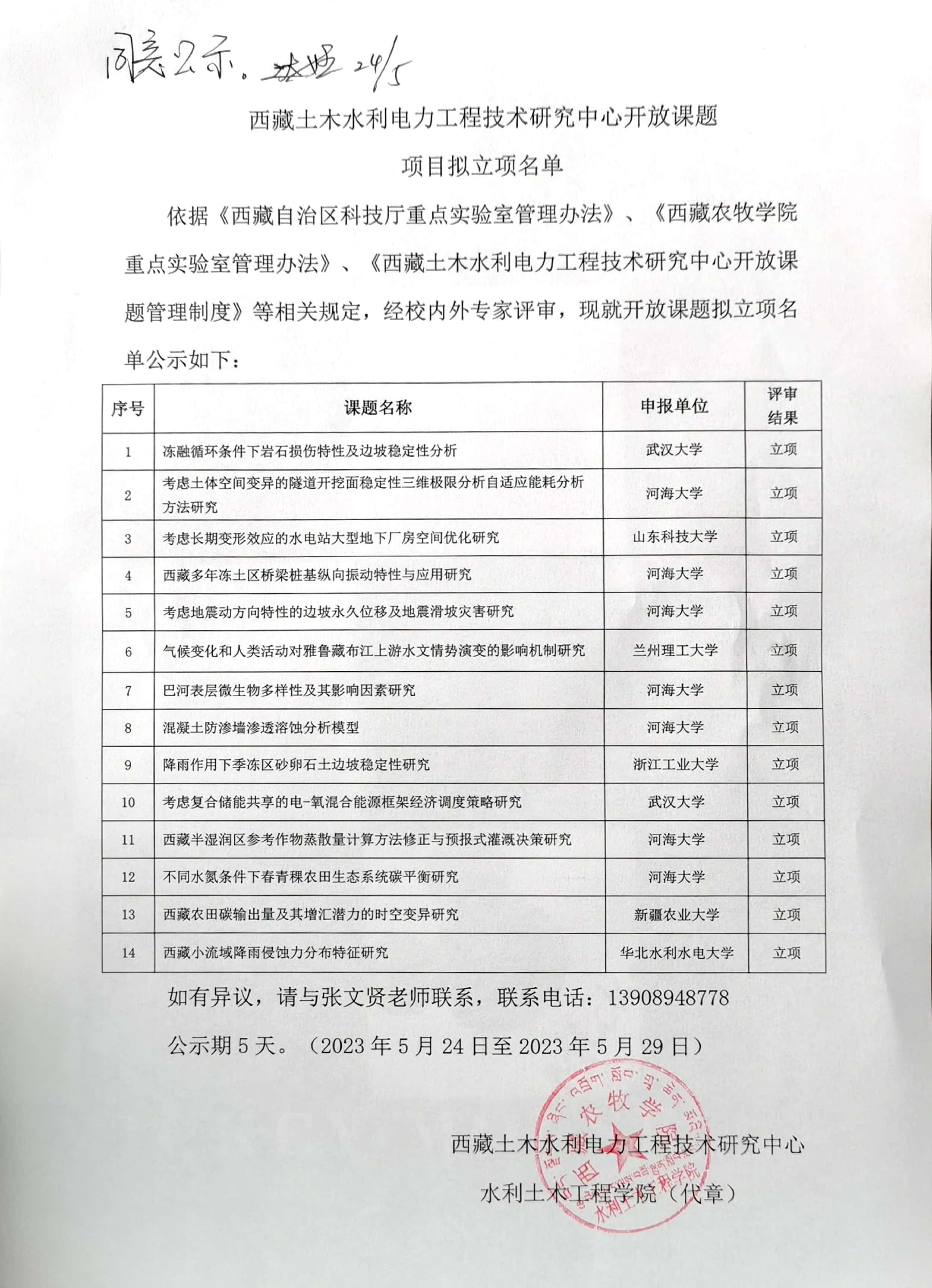 西藏土木水利电力工程技术研究中心开放课题项目拟立项名单