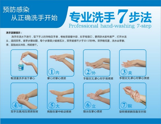 3、正确洗手需掌握七步洗手法:第一步(内):洗手掌 流水湿润双手,涂抹洗手液(或肥皂),掌心相对,手指并拢相互揉搓;第二步(外):洗背侧指缝 手心对手背沿指缝相互揉搓,双手交换进行;第三步(夹):洗掌侧指缝 掌心相对,双手交叉沿指缝相互揉搓;第四步(弓):洗指背 弯曲各手指关节,半握拳把指背放在另一手掌心旋转揉搓,双手交换进行;第五步(大):洗拇指 一手握另一手大拇指旋转揉搓,双手交换进行;第六步(立):洗指尖 弯曲各手指关节,把指尖合拢在另一手掌心旋转揉搓,双手交换进行;第七步(腕):洗手腕、手臂 揉搓手腕、手臂,双手交换进行。