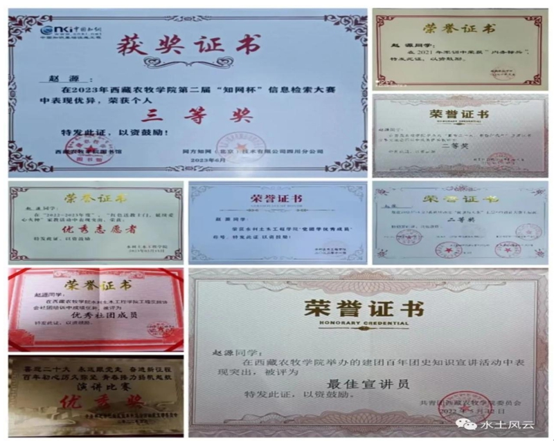 第八届全国大学生水利创新设计大赛特等奖、第二届“知网杯”信息检索大赛三等奖、2023年度林芝市沿河社区民族团结优秀青年、“普科技,炫文化”专业作品科技竞赛一等奖、“阅读与人生”主题PPT设计大赛二等奖获得者