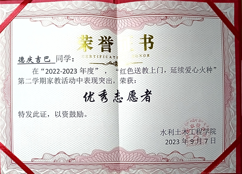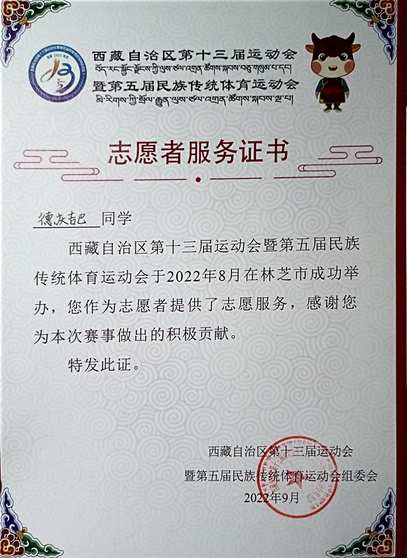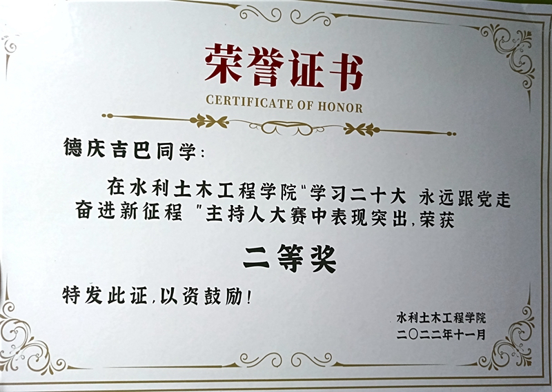 德庆吉巴,藏族,共青团员,2021级水利土木工程学院水利水电专业本科生;担任水利土木工程学院团总支主持部副部长;西藏自治区民族传统体育运动会优秀志愿者、三峡奖学金、优秀学生二等奖、“学习党的二十大,永远跟党走,奋进新征程”优秀主持人二等奖获得者。