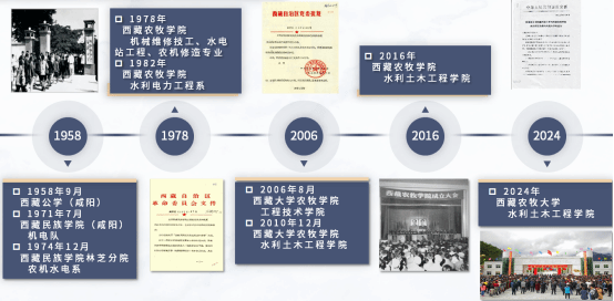 水利土木工程学院是西藏高校最早成立的工科院系。1958年筹建于西藏公学,1971年为“西藏民族学院机电队”,1973年由陕西咸阳迁入西藏林芝八一镇,并改名为“西藏民族学院林芝分院农机水电系”,1978年经国务院批准成立“西藏农牧学院”后,为适应西藏社会经济的发展,于1982年停办“机械维修技工”和“农机修造”专业,扩展了水电专业方向,并改名为“水利电力工程系”。