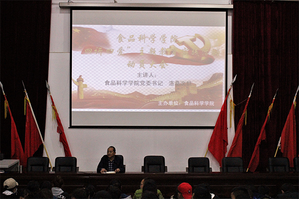 为喜迎党的十九大胜利召开,巩固学院团结稳定发展基础,扎实推进“四讲四爱”实践活动开展。食品科学学院于4月8日18:00在2107教室开展了“四讲四爱”主题教育实践活动动员大会,食品科学学院全体在校师生参加了本次会议,会议由食品科学学院党委书记洛桑次旦主持。