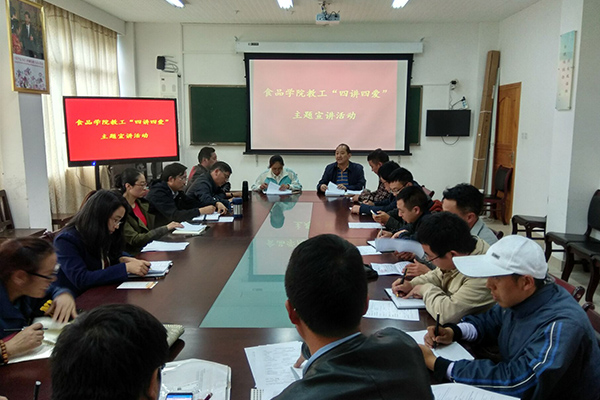 为题提高我院教师使命意识和责任担当意识,教育引导教工发扬老西藏精神,践行四有好老师标准,把对党和祖国的热爱体现在工作中、岗位上,不畏艰难,开拓进取,为西藏教育事业发展、为西藏脱贫攻坚工作,为社会主义新西藏建设,实现伟大的中国梦做出应有的贡献。食品学院于2017年6月23日组织开展了“讲贡献、爱家园”主题宣讲,食品学院全体在校教工参加了宣讲活动,活动由食品科学学院党委书记洛桑次旦主讲。