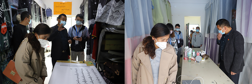 在学生宿舍,食品学院党委副书记索朗才旺与辅导员次仁措老师认真检查宿舍用电、寝室书画内容、食品保质期、卫生打扫、环境消杀、消防器材、消防通道;查看学生床铺质量,线上学习情况,与学生贴心交流,了解学生困难并积极联系学校相关职能部门进行解决;没收违禁物品,教育引导学生重视安全问题,绷紧安全防线。