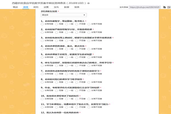 为了进一步牢固树立教学质量意识,认真分析实际教学工作中存在的问题,近期食品科学学院结合“食品科学学院教育思想大讨论实施方案”通过金数据网络系统和意见函开展了教学质量期中监测和教学过程意见反馈与调研工作。本次监测针对本学期开设的所有课程的实际教学效果和学生掌握程度进行了集中反馈,并对本学期的教育教学管理工作进行了意见征询。截止到目前共回收532份有效教学质量期中监测调查表,学生的参与率达到百分之百。