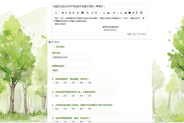 希望通过教学技能大练兵活动,便于发现优秀教学能手结合食品科学学院教学技能大练兵活动安排,学院教学科于2018年5月14日利用金数据软件以本院教师的授课班级为单位发放“食品科学学院教学质量反馈表”。此表将会反馈给任课教师,便于教师分析在授课中的亮点以及自身存的问题和学生对课程的教学反馈。