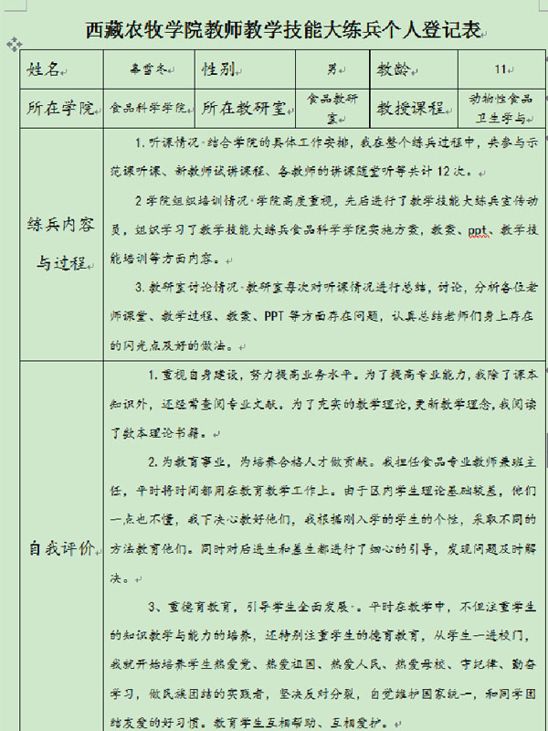 根据《西藏农牧学院教师教学技能大练兵实施方案》精神,食品科学学院按照《食品科学学院教师教学技能大练兵实施方案》要求,于5月22日开始开展教师自评工作。要求各教师根据学院开展教学技能大练兵以来所有的培训、同行的评价、学生对课程教学质量的反馈情况进行自我分析、总结。并认真填写“西藏农牧学院教师教学技能大练兵个人登记表”。