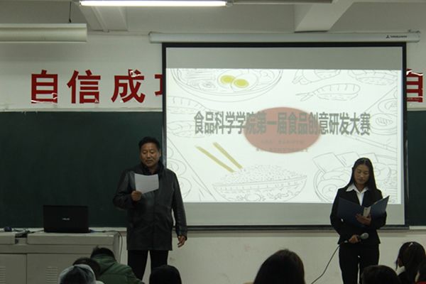 创意研发大赛首先由主持人介绍到场嘉宾及领导、比赛规则,副院长罗章致开场词。在热烈的掌声中比赛正式开始,其次各代表队代表根据抽签顺序轮流上台,对各自创意计划书的项目以PPT的形式进行详细的讲解。紧接着由评委进行提问。在这次比赛中青稞高纤小馒头、松茸藏香猪肉酱、手撕发酵牦牛肉等一系列创意食品脱颖而出进入复赛,最后由杨林副教授总结致词。