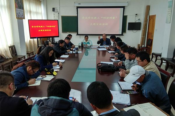 为题提高我院教师使命意识和责任担当意识,教育引导教工发扬老西藏精神,践行四有好老师标准,把对党和祖国的热爱体现在工作中、岗位上,不畏艰难,开拓进取,为西藏教育事业发展、为西藏脱贫攻坚工作,为社会主义新西藏建设,实现伟大的中国梦做出应有的贡献。食品学院于2017年6月23日组织开展了“讲贡献、爱家园”主题宣讲,食品学院全体在校教工参加了宣讲活动,活动由食品科学学院党委书记洛桑次旦主讲。