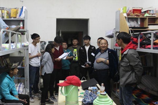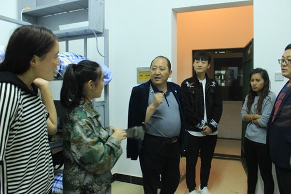 首先,走访了9栋、16栋男、女新生宿舍。每走进一间宿舍,洛桑次旦书记都悉心询问宿舍的藏汉比例、入校感受及适应情况。并对新生宿舍是一个小家庭,都是来自不同的地方,同学之间要融洽相处,多进行交流;藏族同学在宿舍要讲普通话,同学间要相互关心,相互帮助。”马少飞老师和次仁措老师就军训期间的着装、发型等方面的要求和请假问题等一一耐心讲解。
