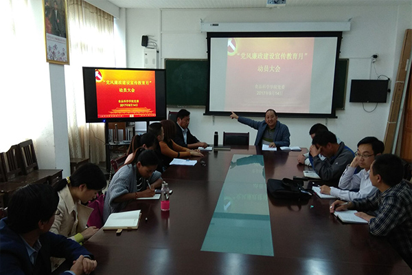 为贯彻落实党的十八届六中全会和自治区第九次党代会精神,加强党员教育管理,推进全面从严治党。根据《西藏农牧学院“党风廉政建设宣传教育月”实施方案》要求和食品科学学院党委安排部署,学院于9月14日组织在校教职工党员召开了教工党员 “党风廉政宣传教育月”动员大会,会议由食品学院党委书记洛桑次旦主持。