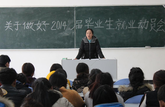 为全力做好我院2014年毕业生就业工作,重点落实我区高校毕业生公开考录考试时间和考试科目调整等就业新政策的相关要求,我院于2014年3月11日下午组织了食品科学学院2014届毕业生就业工作专题教育会议。会议由食品科学学院党总支副书记德吉梅朵主持,负责我院就业工作辅导员马少飞、2010级食品科学与工程本科2班班主任王超以及全体2014届毕业生参加了此次会议。