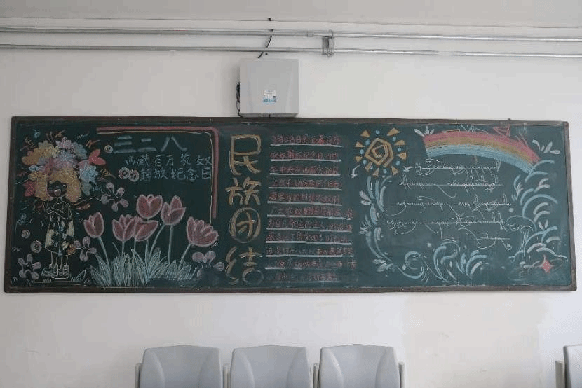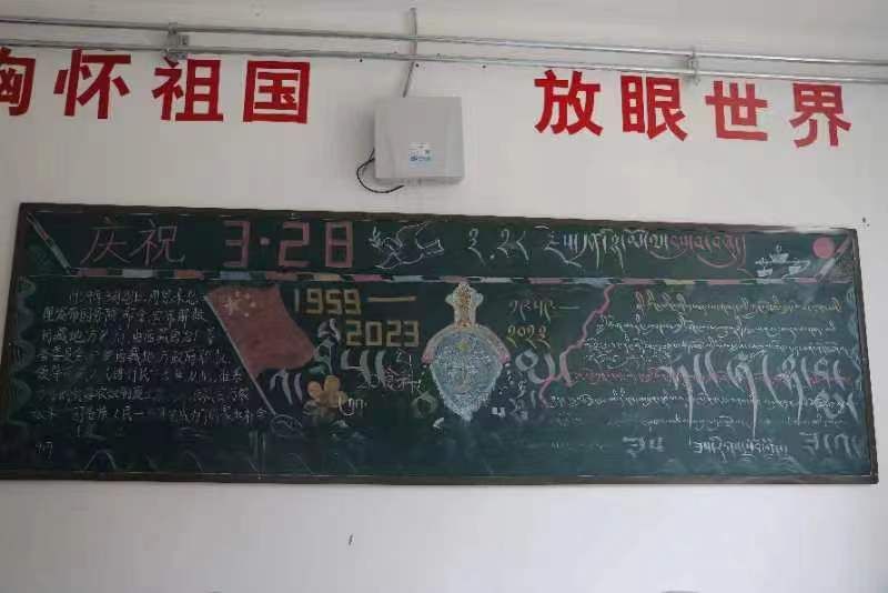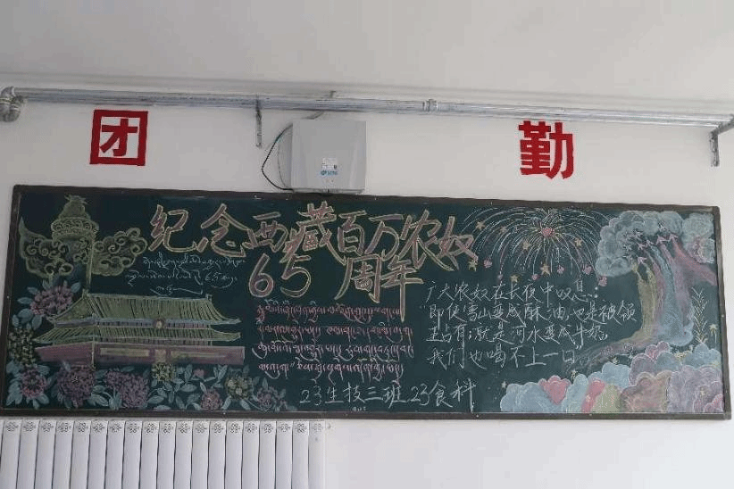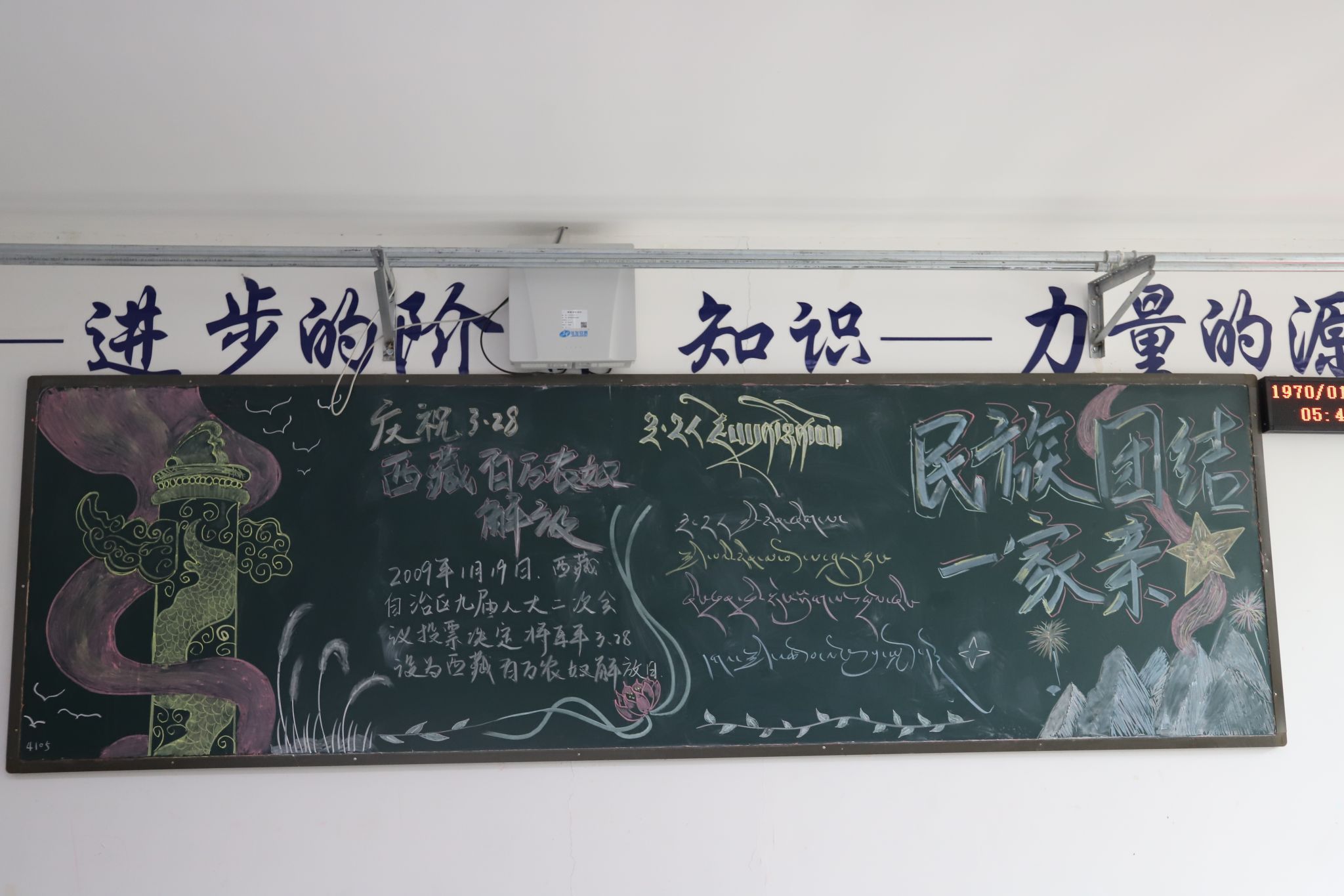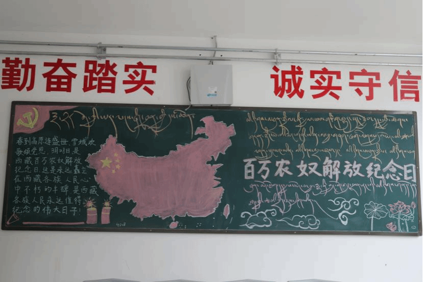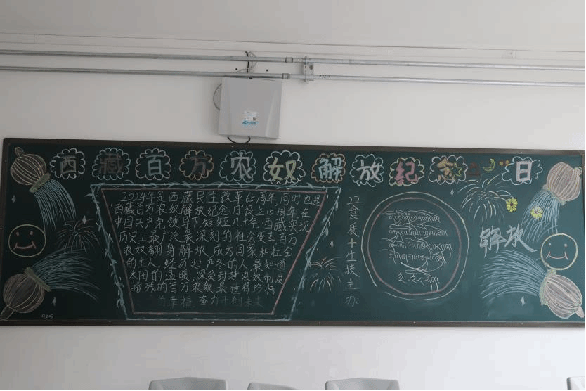 此次比赛共设八间教室,各班以合作的形式完成。要求板报内容必须围绕“西藏百万农奴解放纪念日”主题,文字工整、色彩鲜艳、排版美观。