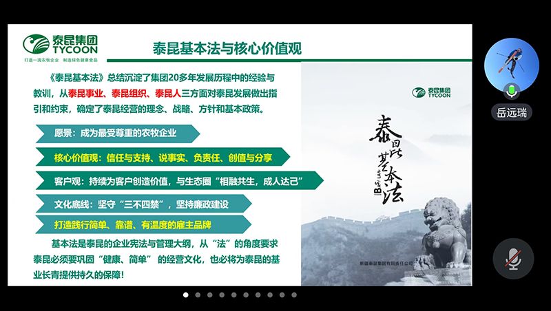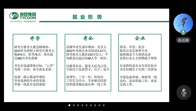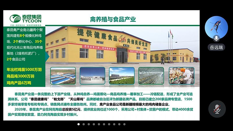 讲座开始,岳经理先作了自我介绍,在石河子大学毕业后便进入企业工作,泰昆集团是新疆最大的饲料企业集团之一,疆内建有7家子公司,在西南和华北等地建有8家子公司。泰昆集团主要从事农业生产,涉及农业和畜牧业等。此外,岳经理着重向同学们介绍了企业的员工培养模式、薪资待遇、企业文化、员工福利等。相较于自主创业,此次讲座重在引导同学们树立正确的就业观念。