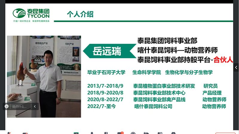 为开拓我院学子眼界,增长见识,以助力广大学子就业、创业为契机,2024年5月21日15点我院禄亚洲老师邀请新疆泰昆集团喀什泰昆饲料公司动物营养师岳远瑞线上为我院生物技术2021级本科班分享其工作经历和经验。