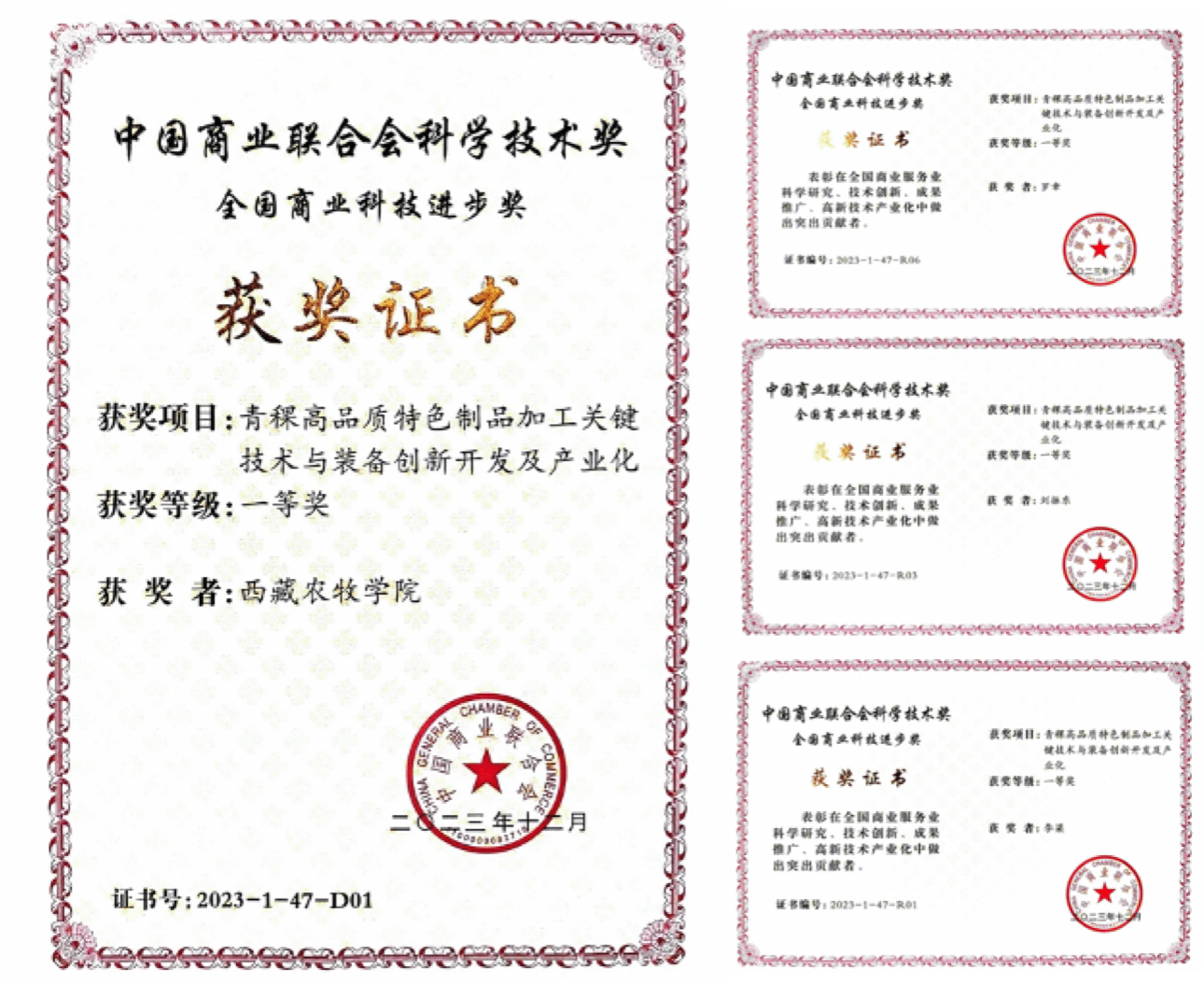 近日,中国商业联合会发布了“2023年度中国商业联合会科学技术奖”评选结果的公告。由我院李梁副教授主持,刘振东副教授、罗章教授参与申报的“青稞高品质特色制品加工关键技术与装备创新开发及产业化”项目,荣获“2023年度中国商业联合会科学技术奖——全国商业科技进步奖”一等奖,我校为第一完成单位,充分彰显了我院在科研创新与成果转化方面的显著贡献。