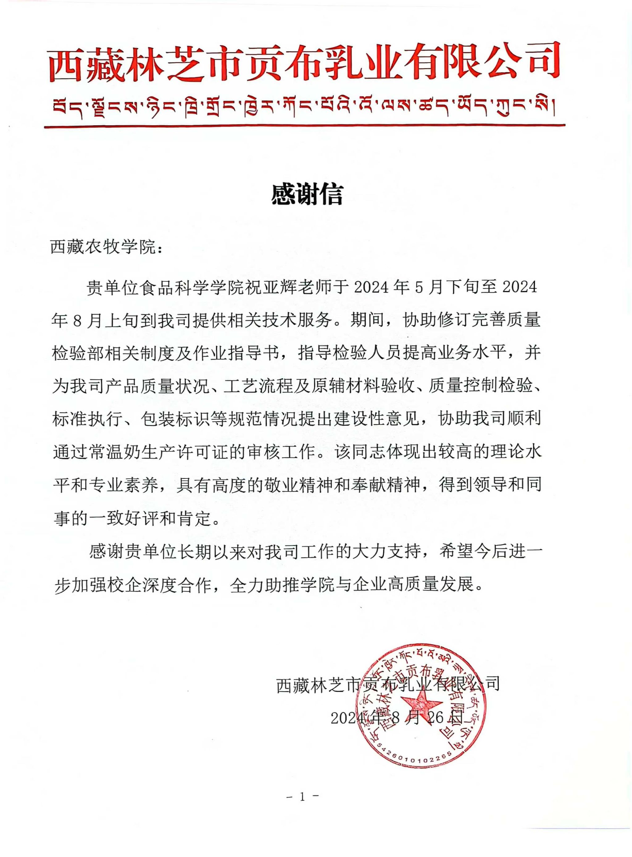 西藏贡布乳业有限公司为感谢祝亚辉博士为企业提供的技术指导,专门给学校发来感谢信,充分肯定学校教师在服务地方经济发展的作用,对进一步深化校企合作充满期待。